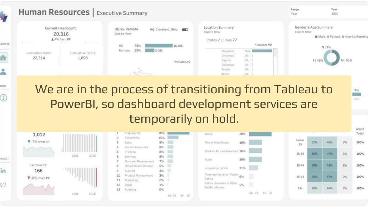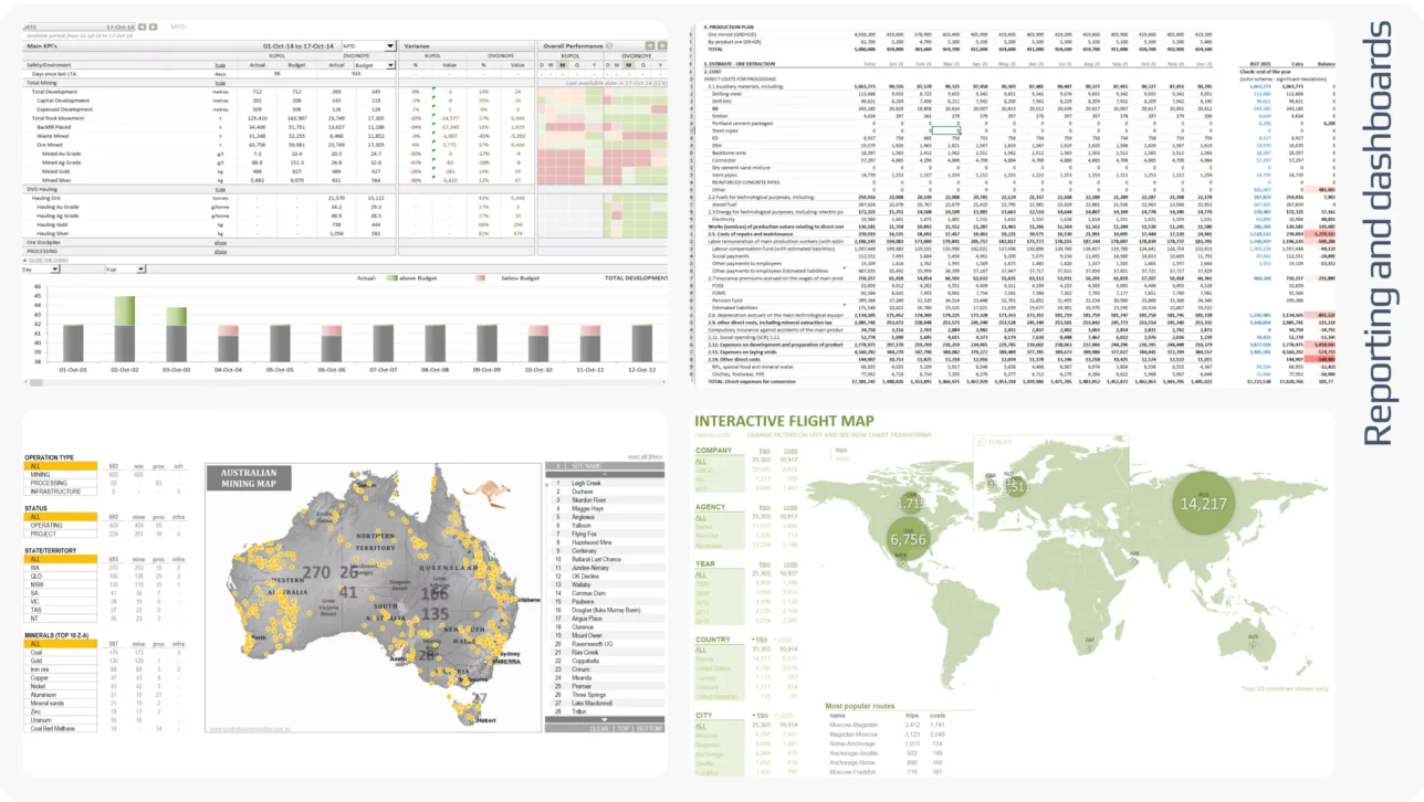 We develop production and financial reporting dashboards. We use PowerBI as a primary tools, but Excel could be used as well. We can develop dashboard only, or provide you turn-key solution (database connections, DWH, ETL, etc)