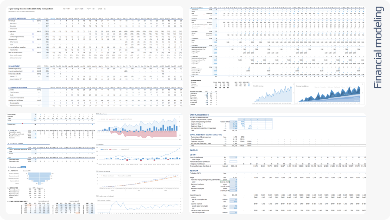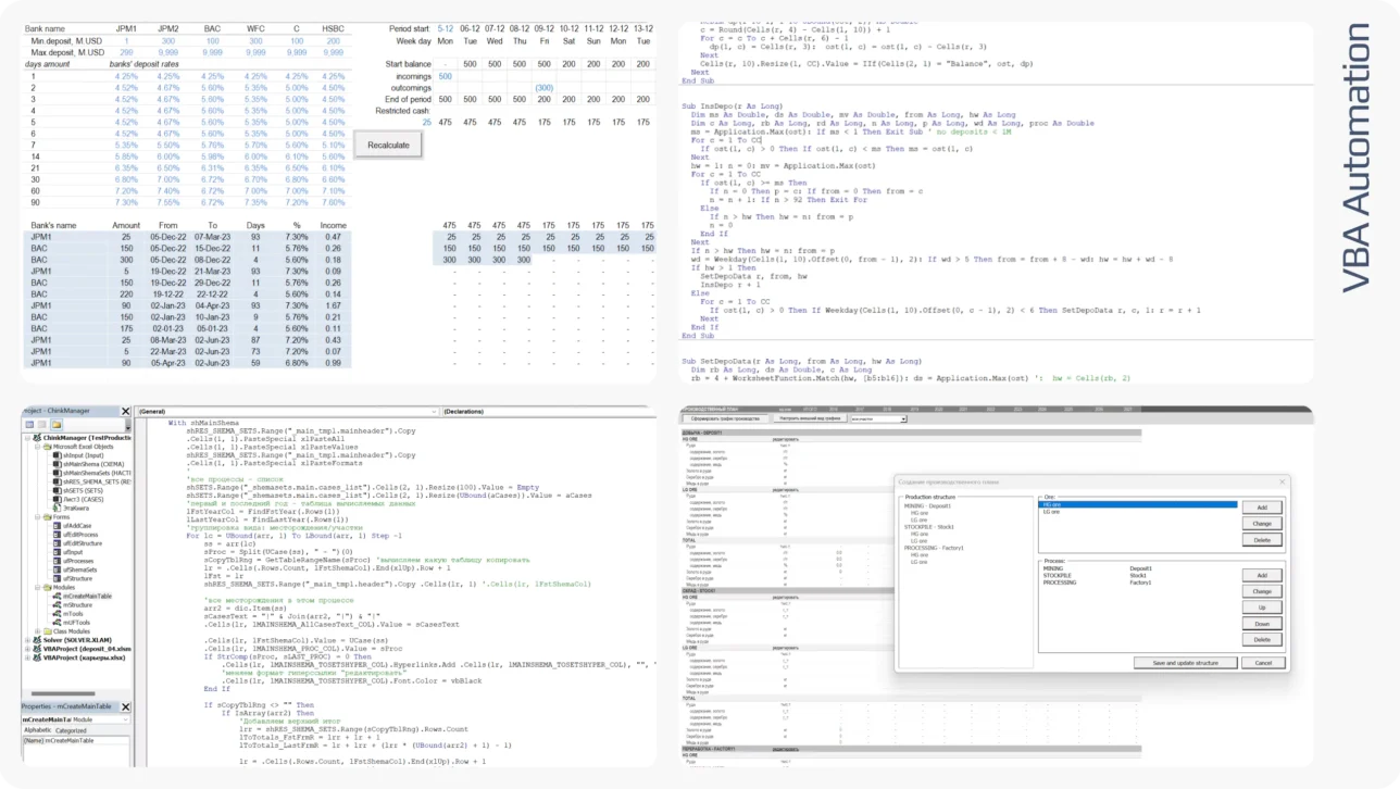 We develop proprietary solutions in MS Excel for businesses: budget models (production and financial), business evaluation, various calculations (from tables to statistics), automation (VBA), audit and more. We provide solutions with user-friendly interface and clean design.